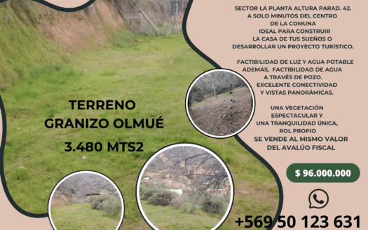 Venta terreno de 3.480 Mts2 ubicados en Olmué, Granizo, sector La Planta, altura Parad. 42 a sólo minutos del centro de la Comuna, ideal para construir la casa ...